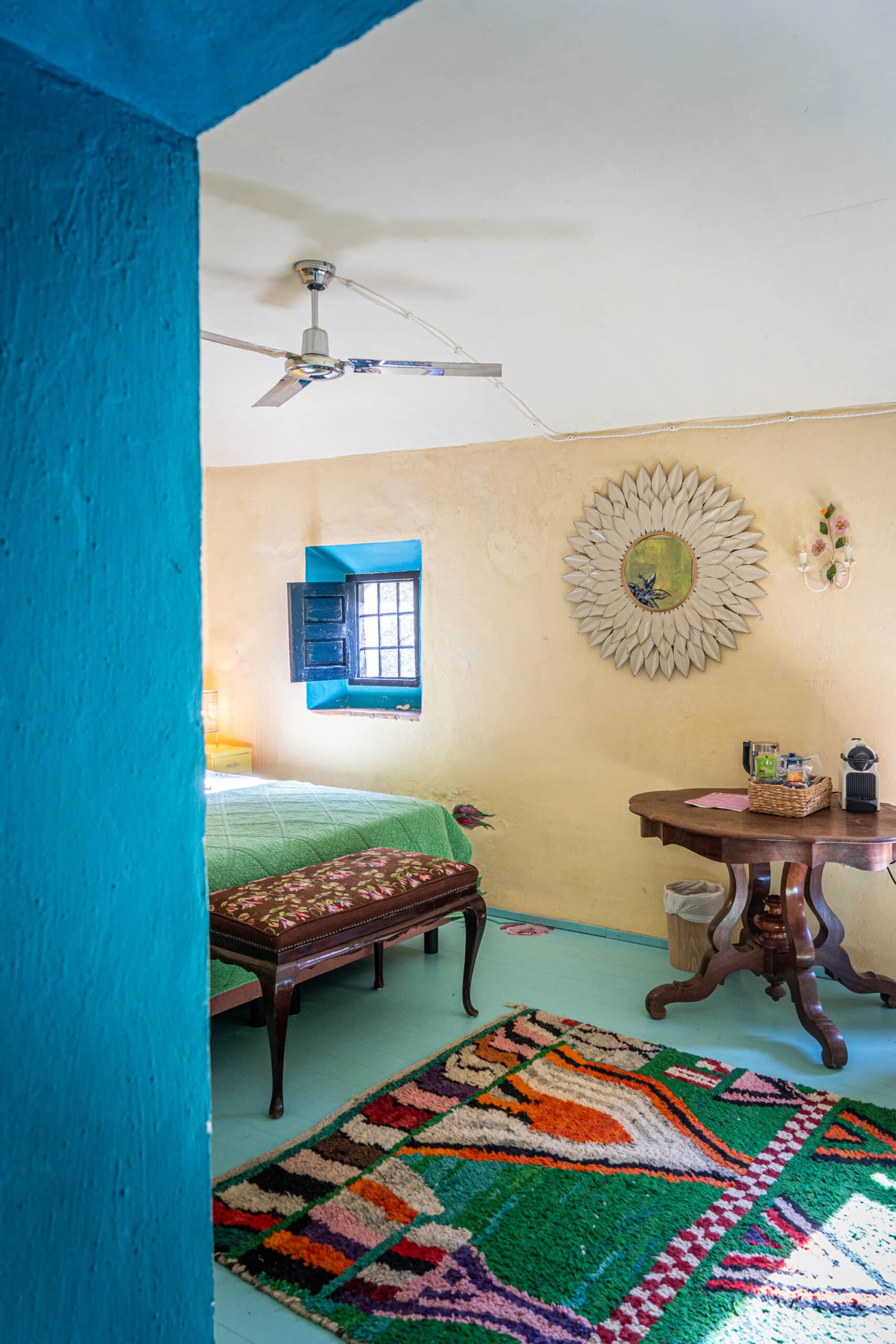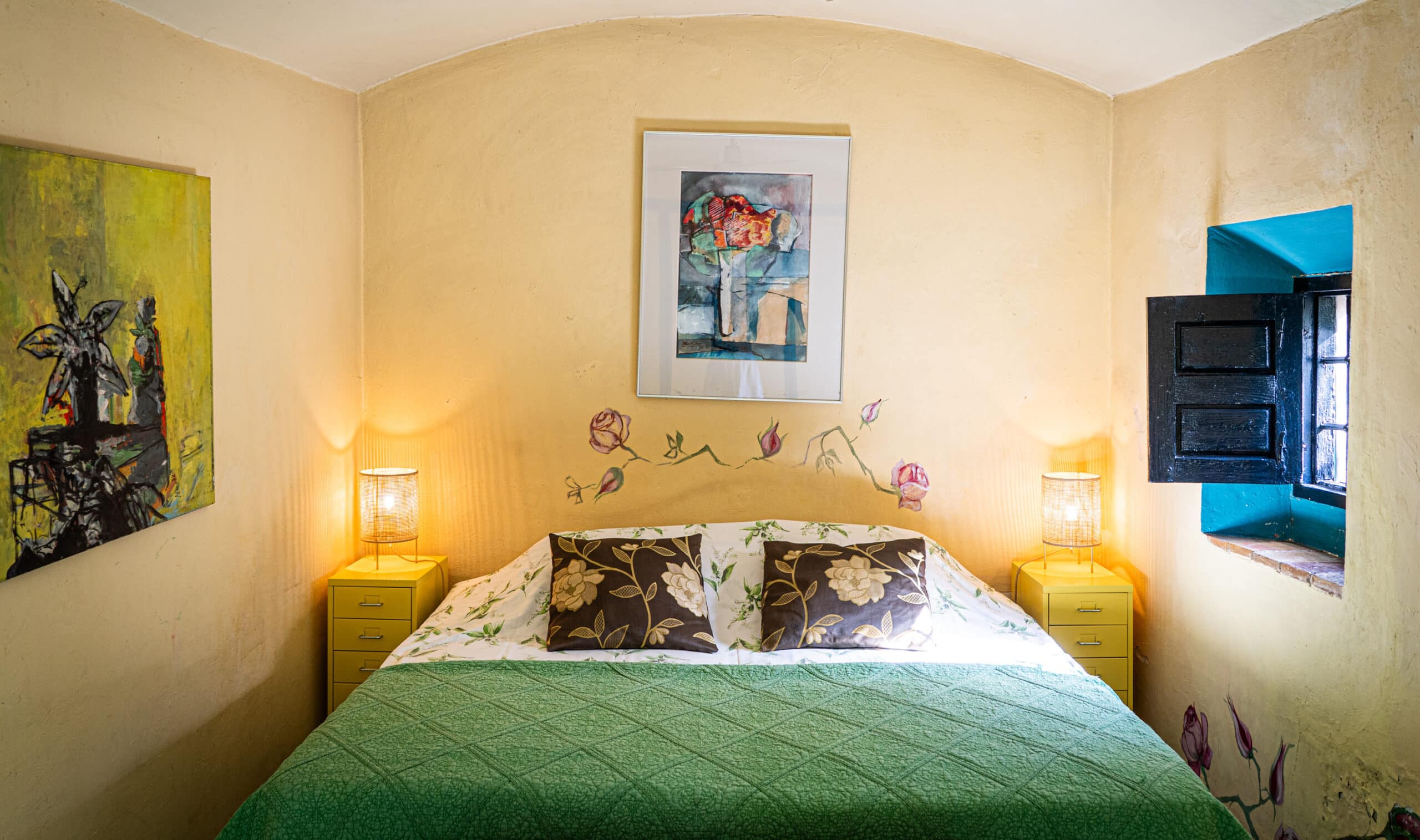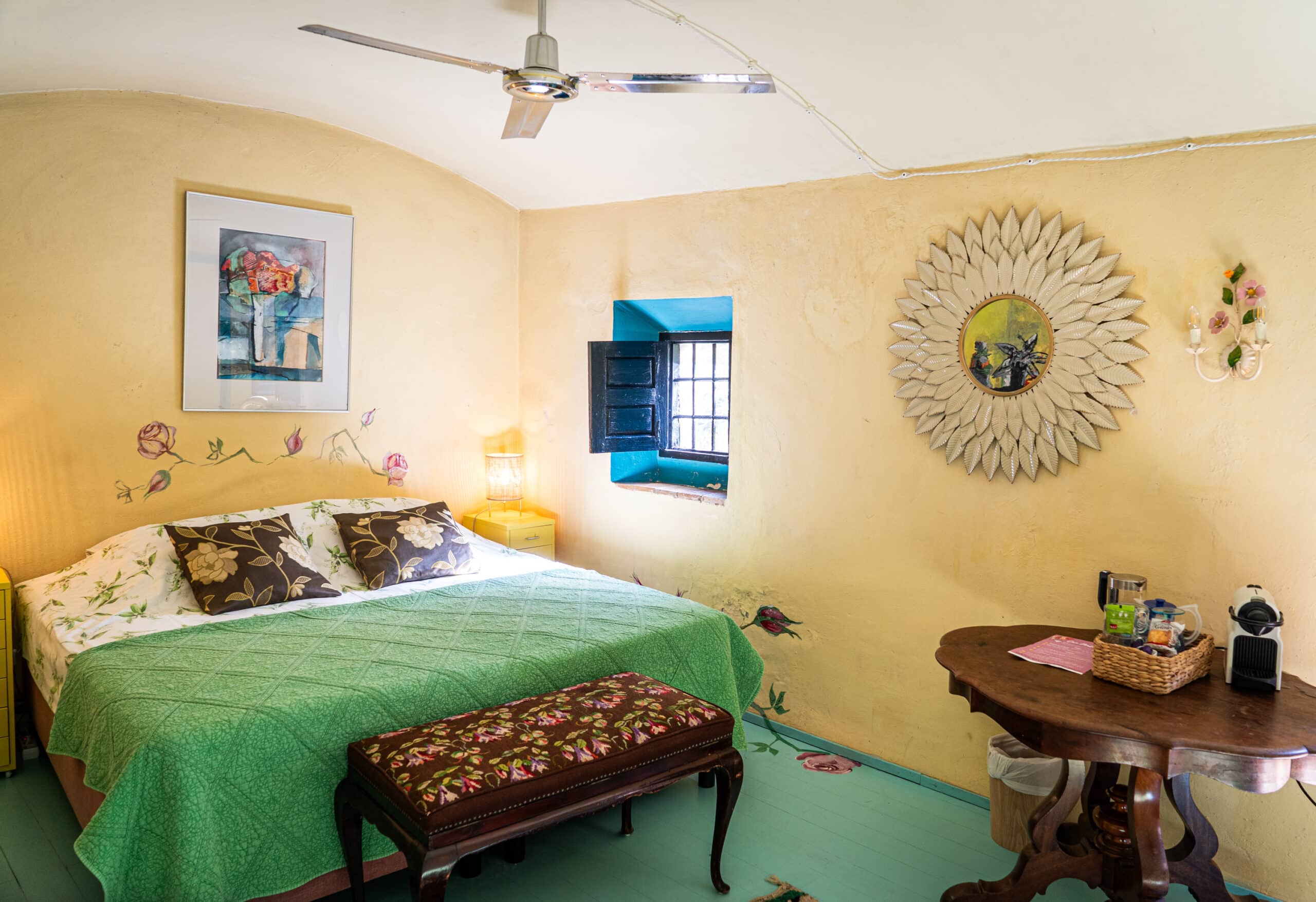 Het Groen Genoegen, romantiek voor twee. Deze kamer met rozen beschilderde vloer en haar prachtige lichtinval is de perfecte plek om je liefje ten huwelijk te vragen.