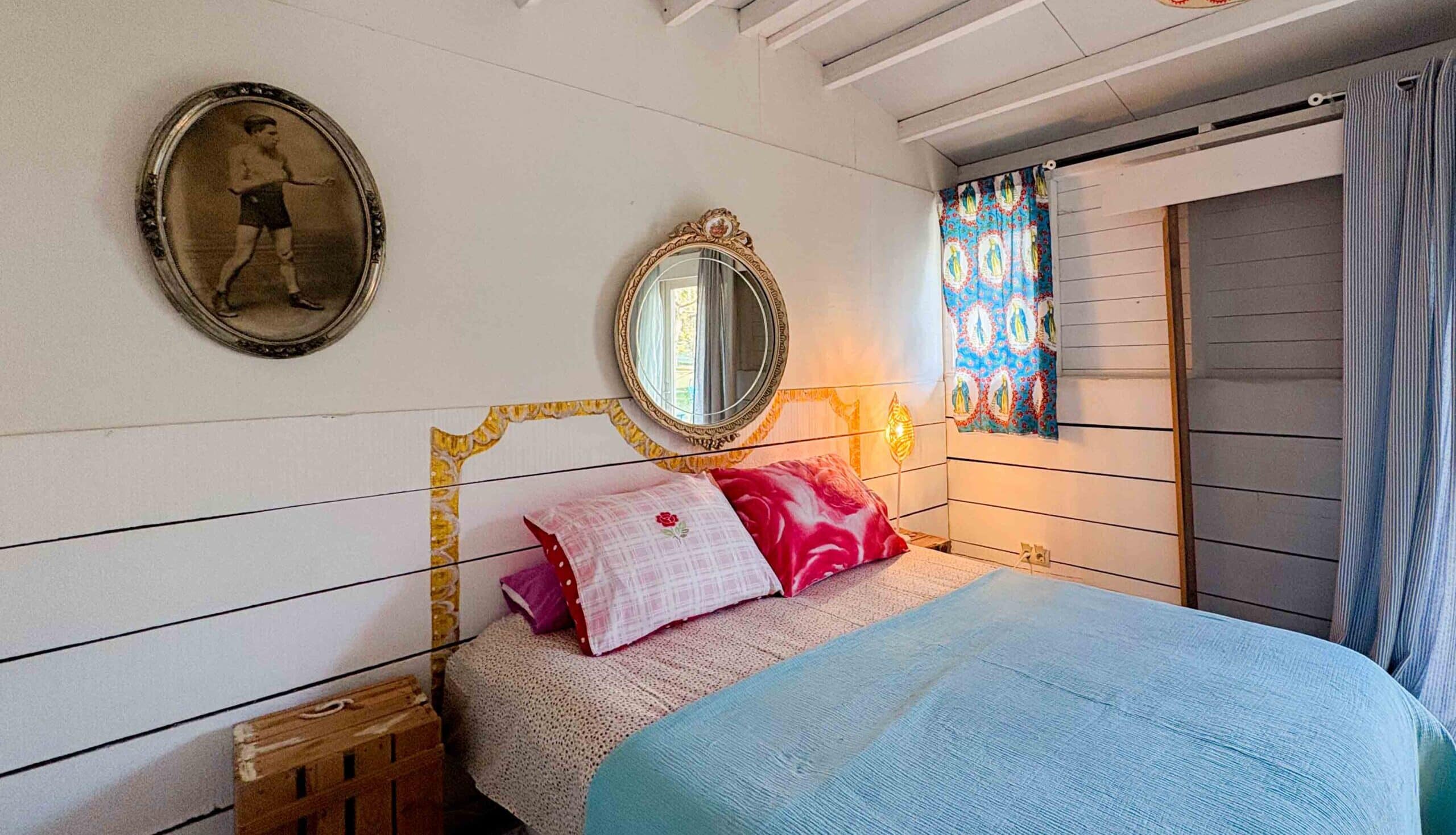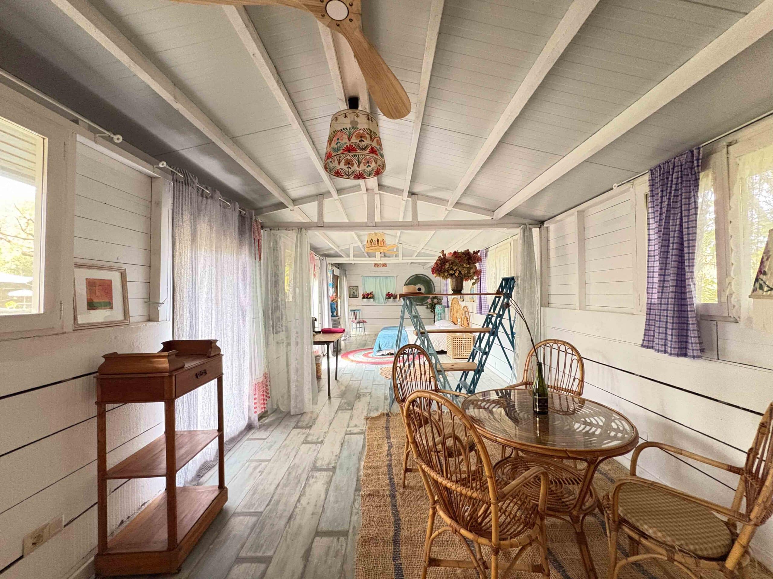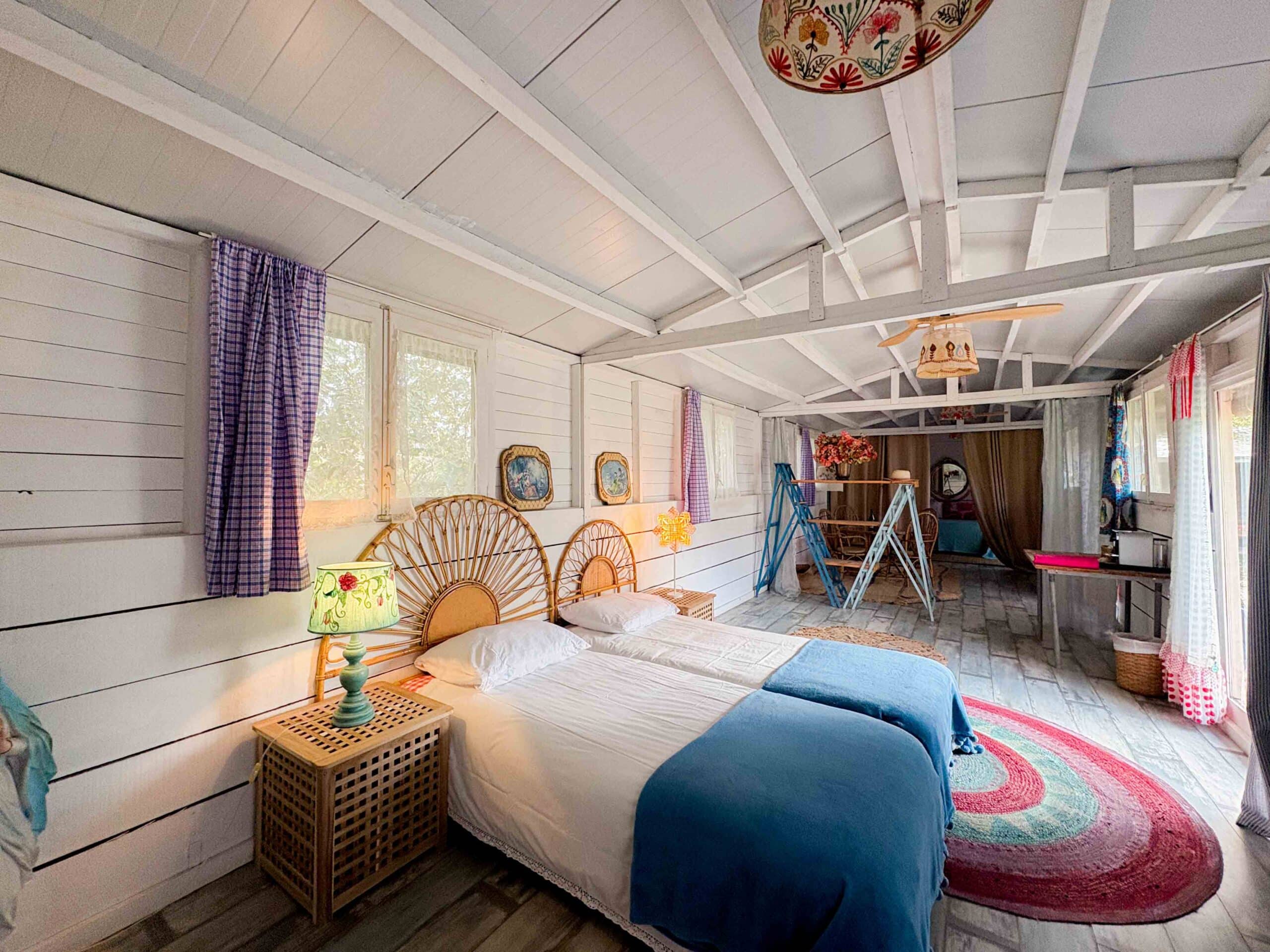 Het Tuinhuis gebruiken we soms als (familie)slaapkamer, maar is ook vaak in gebruik als atelier voor creatieve groepen. Er ligt een stoere houten vloer op de grond. Als het tuinhuis als slaapkamer dient, staat er meestal een tweepersoonsbed en twee eenpersoonsbedden. De ernaast gelegen zadelkamer is tot badkamer verbouwd.